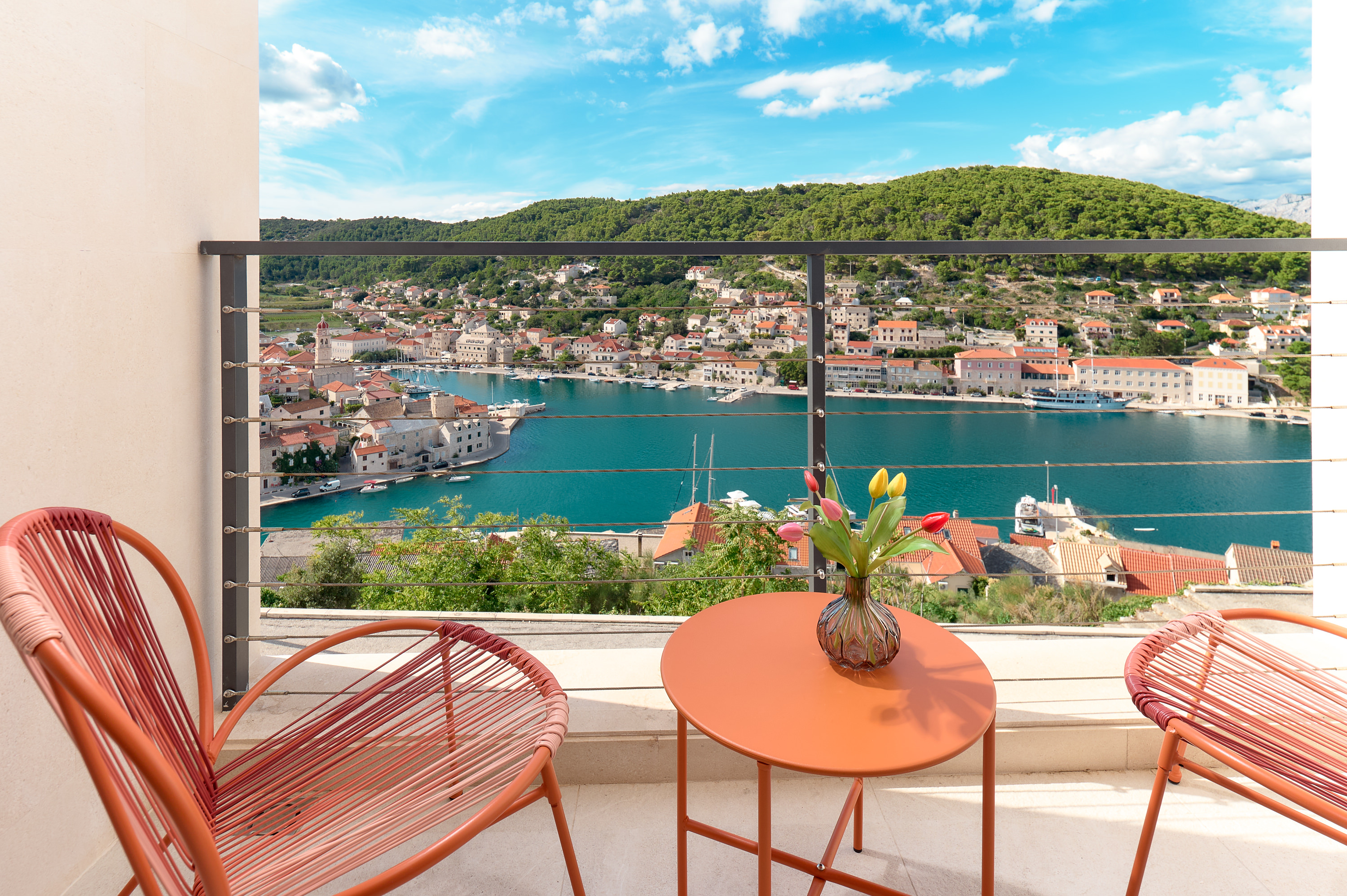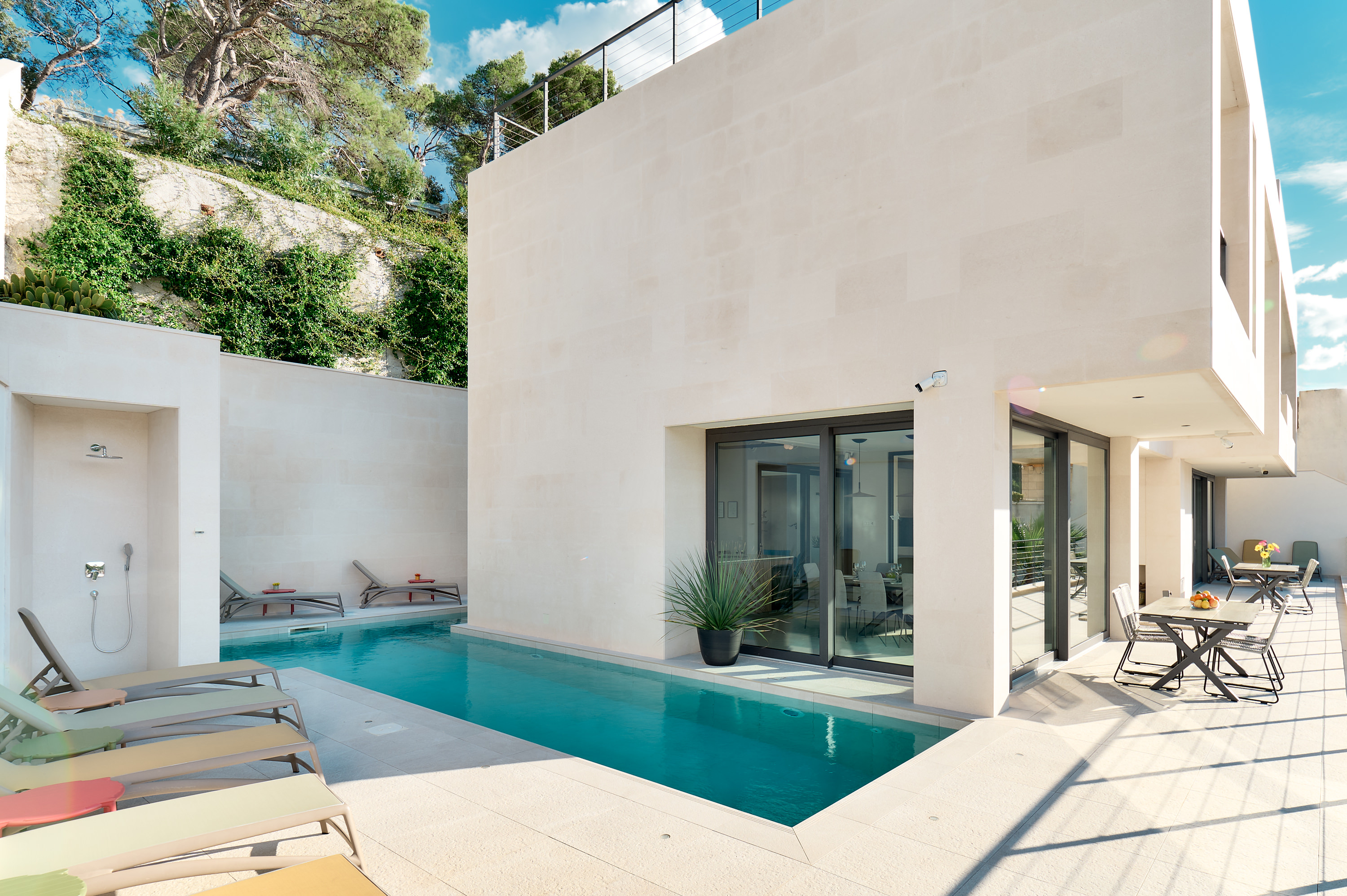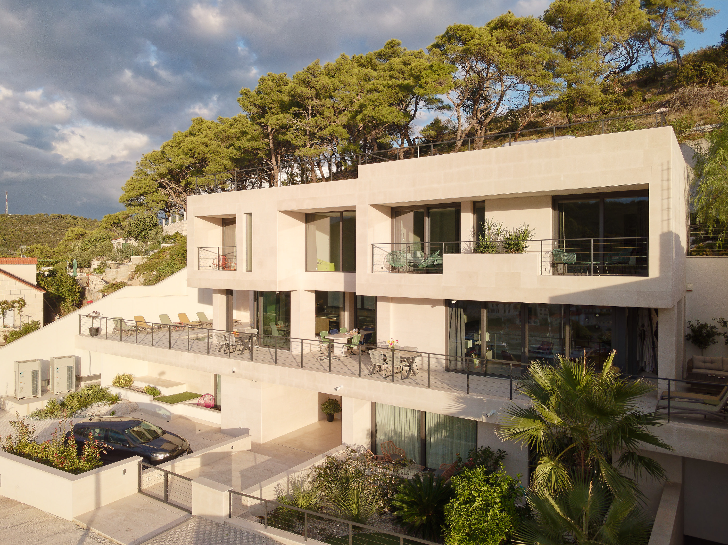 The Glass House is a contemporary luxury villa set above the village of Pučišća on the island of Brač, offering sweeping panoramic views of the Adriatic Sea. Designed by award-winning architect Damir Rako, the villa combines modern architecture with refined comfort, creating a calm and elegant retreat for groups and families.