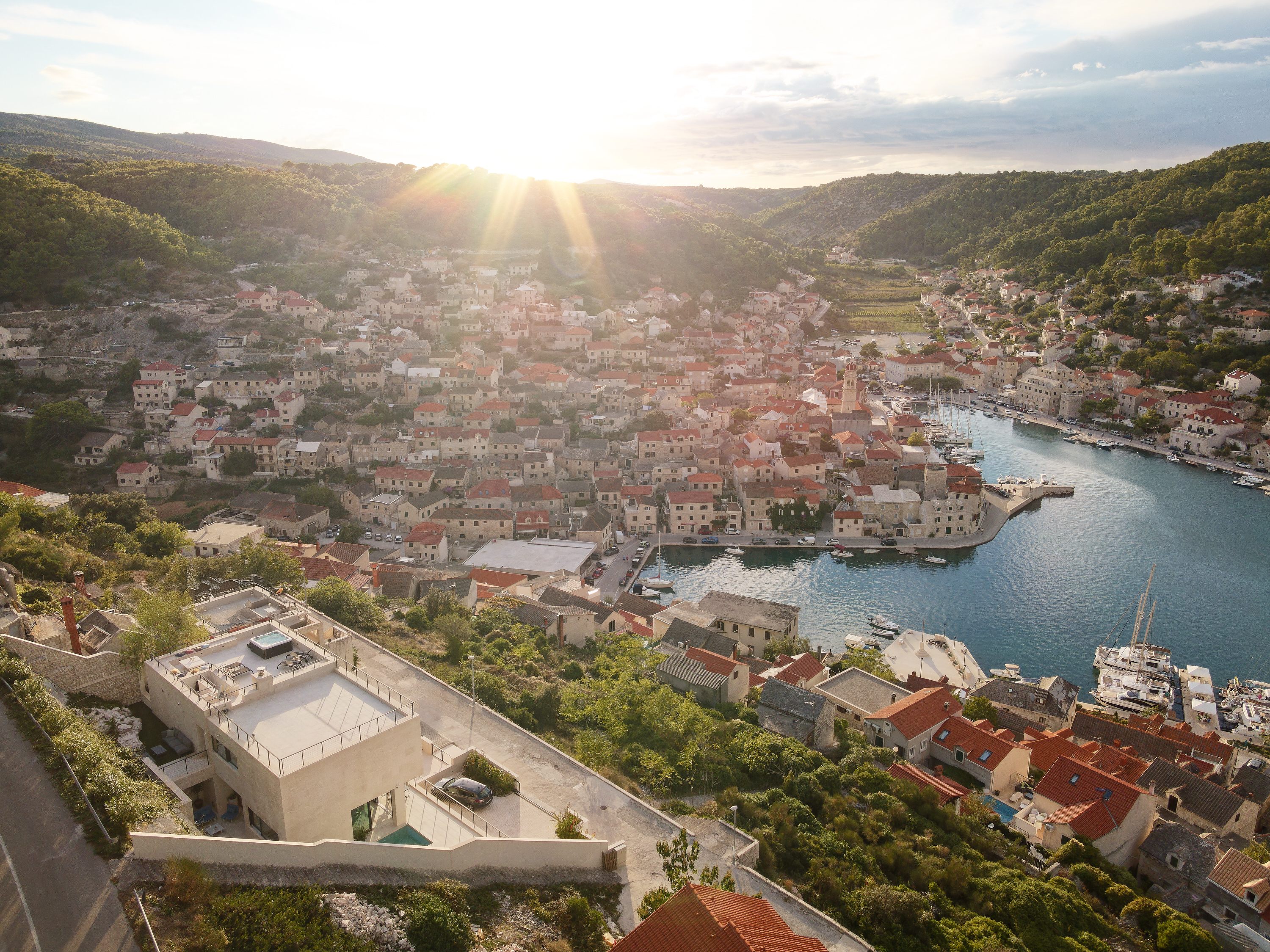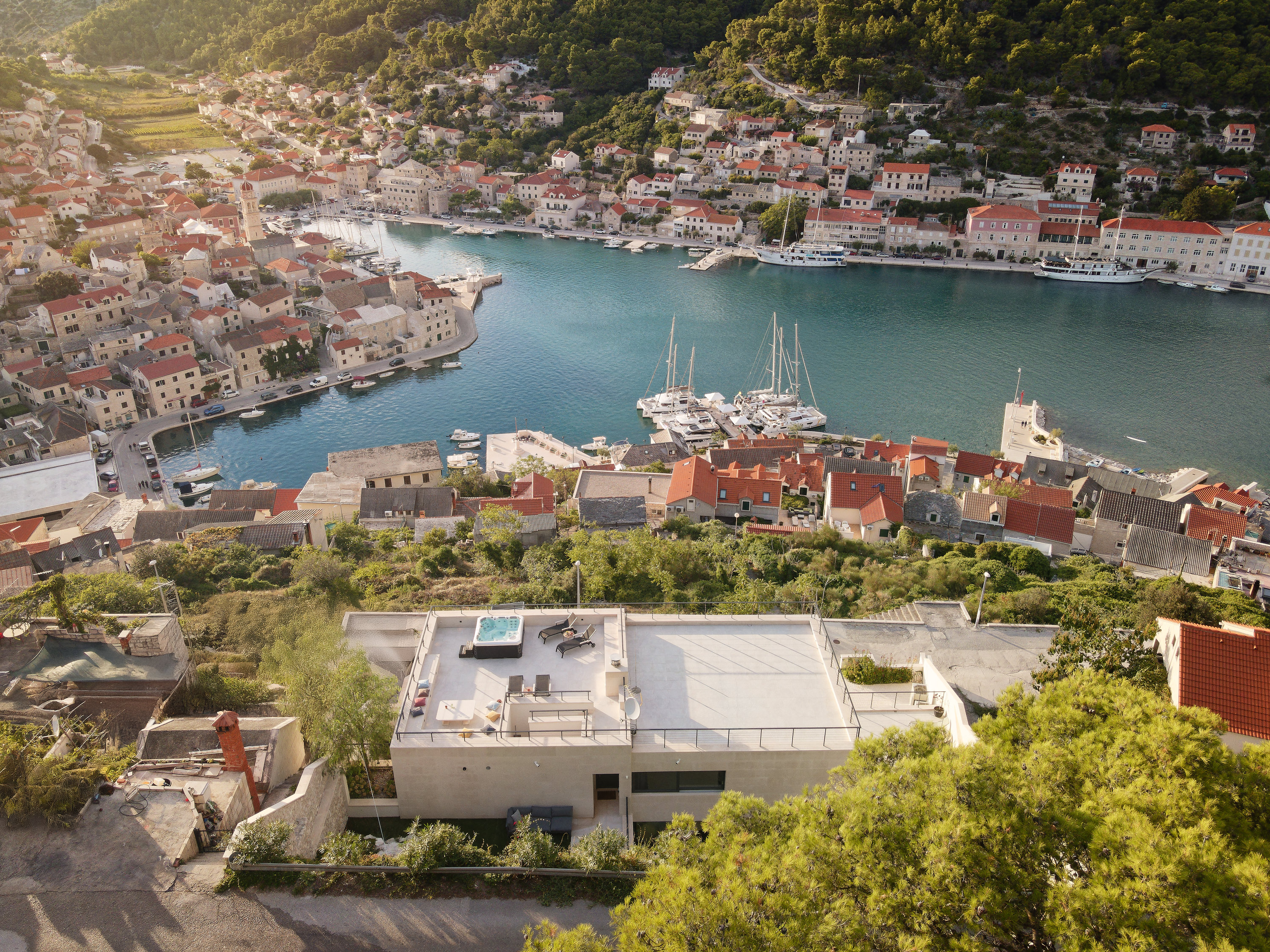 Highlights include a private heated swimming pool with a generous shallow area, a rooftop jacuzzi overlooking Pučišća, and a shaded outdoor kitchen with BBQ and pizza oven — ideal for long lunches and evening dining under the stars.