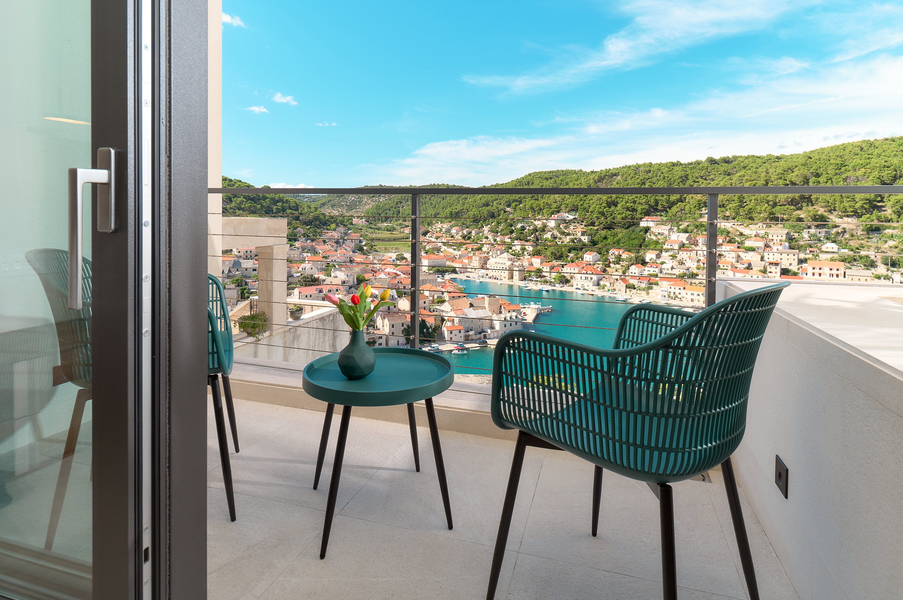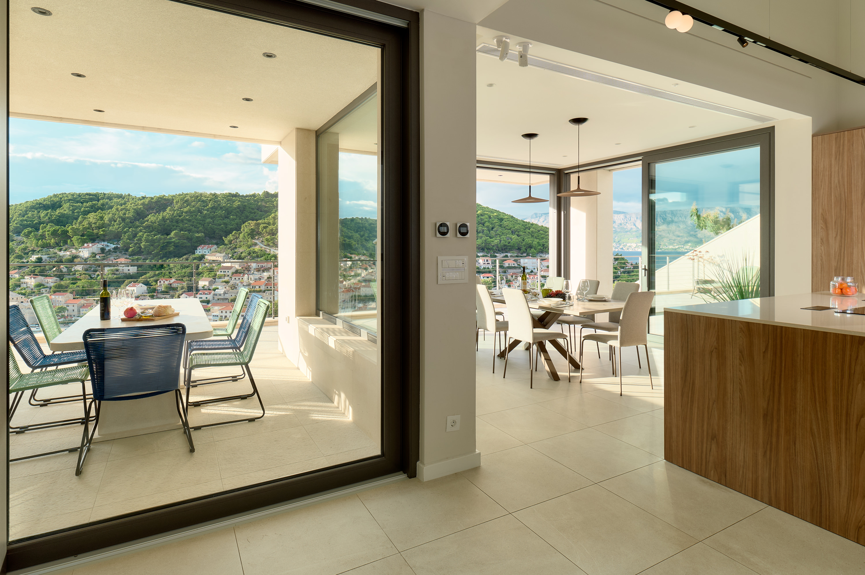 Floor-to-ceiling glass, clean lines, and generous terraces allow indoor and outdoor spaces to flow seamlessly, while elevated positioning ensures privacy and uninterrupted views across the sea and village below.