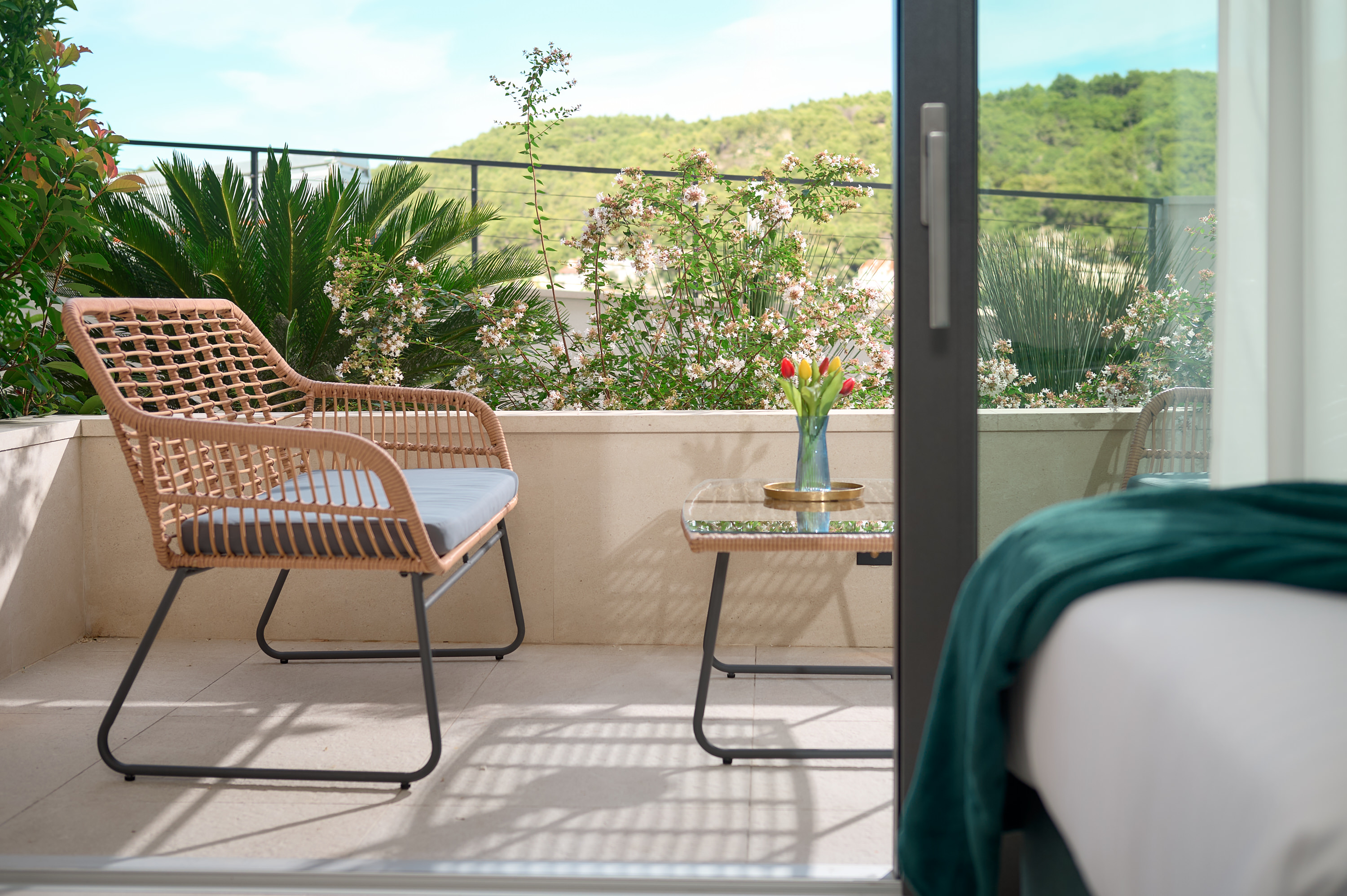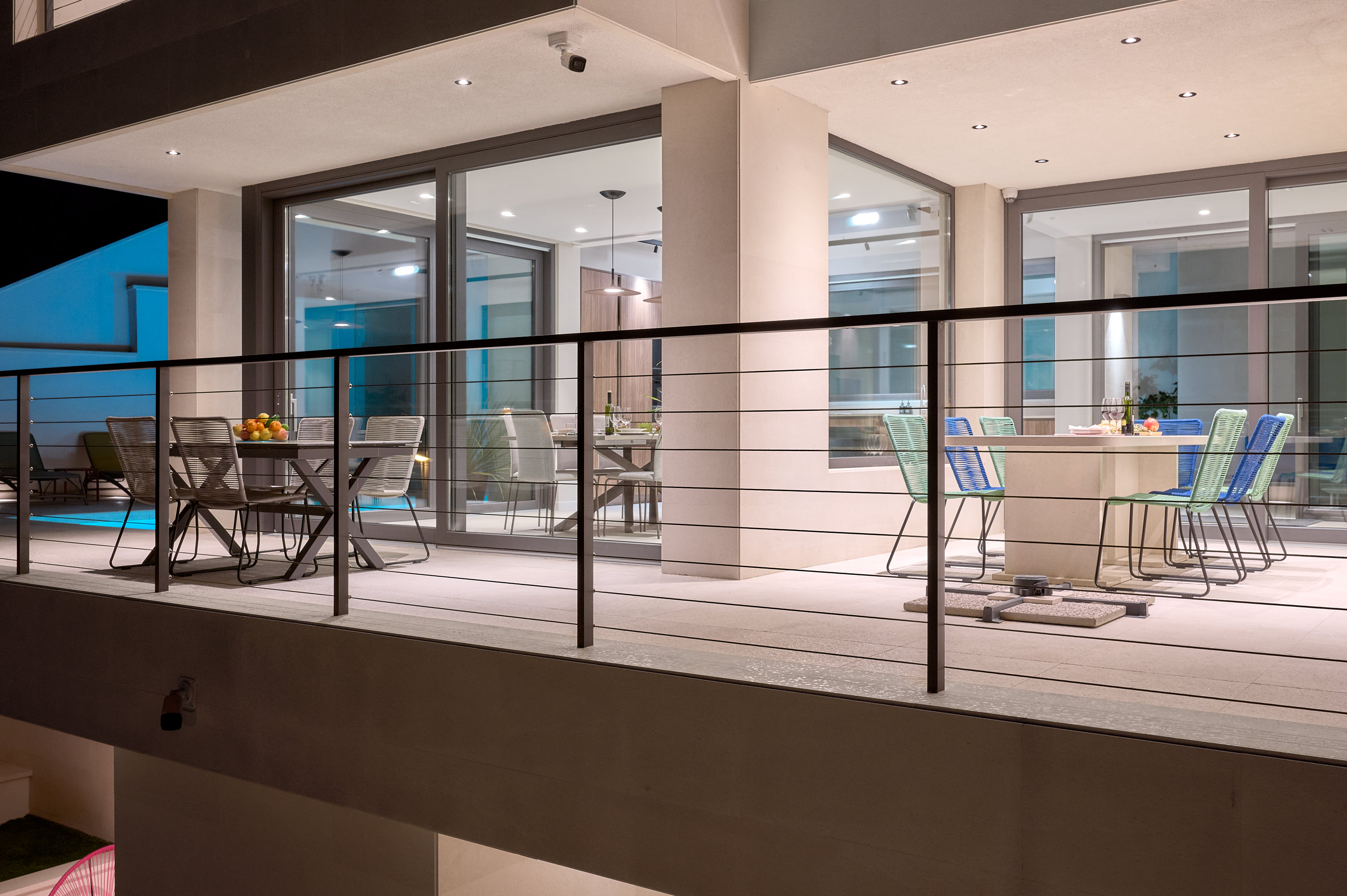 The outdoor spaces at The Glass House are designed for relaxation, socialising, and enjoying the Mediterranean climate. Expansive terraces provide multiple seating areas, allowing guests to gather together or enjoy quiet moments with panoramic sea views.