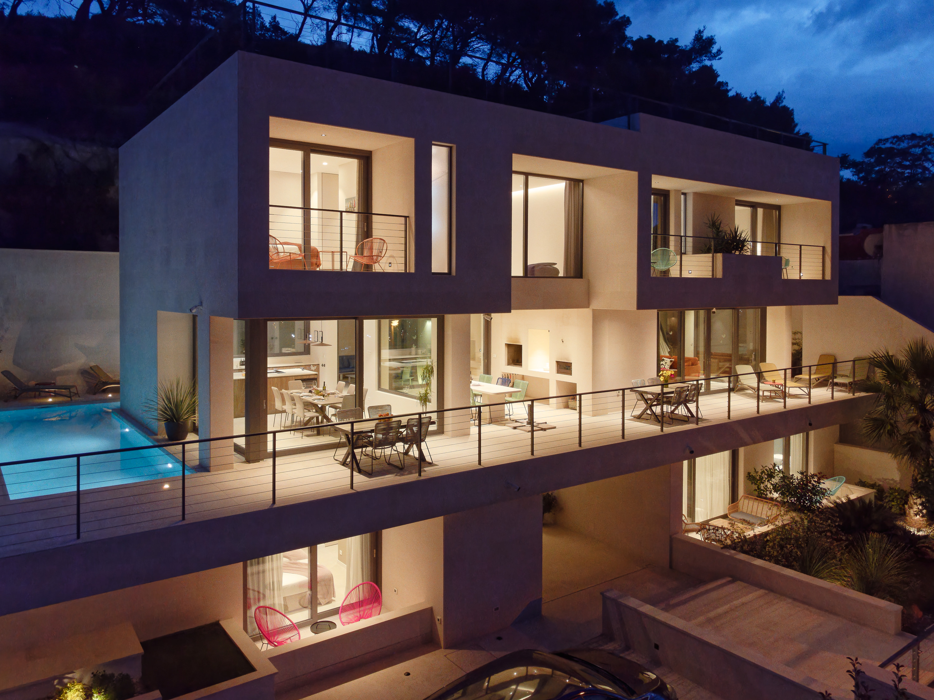 The Glass House is an award-winning architectural villa above Pučišća on Brač, defined by contemporary design, panoramic Adriatic views, and open, light-filled living spaces.