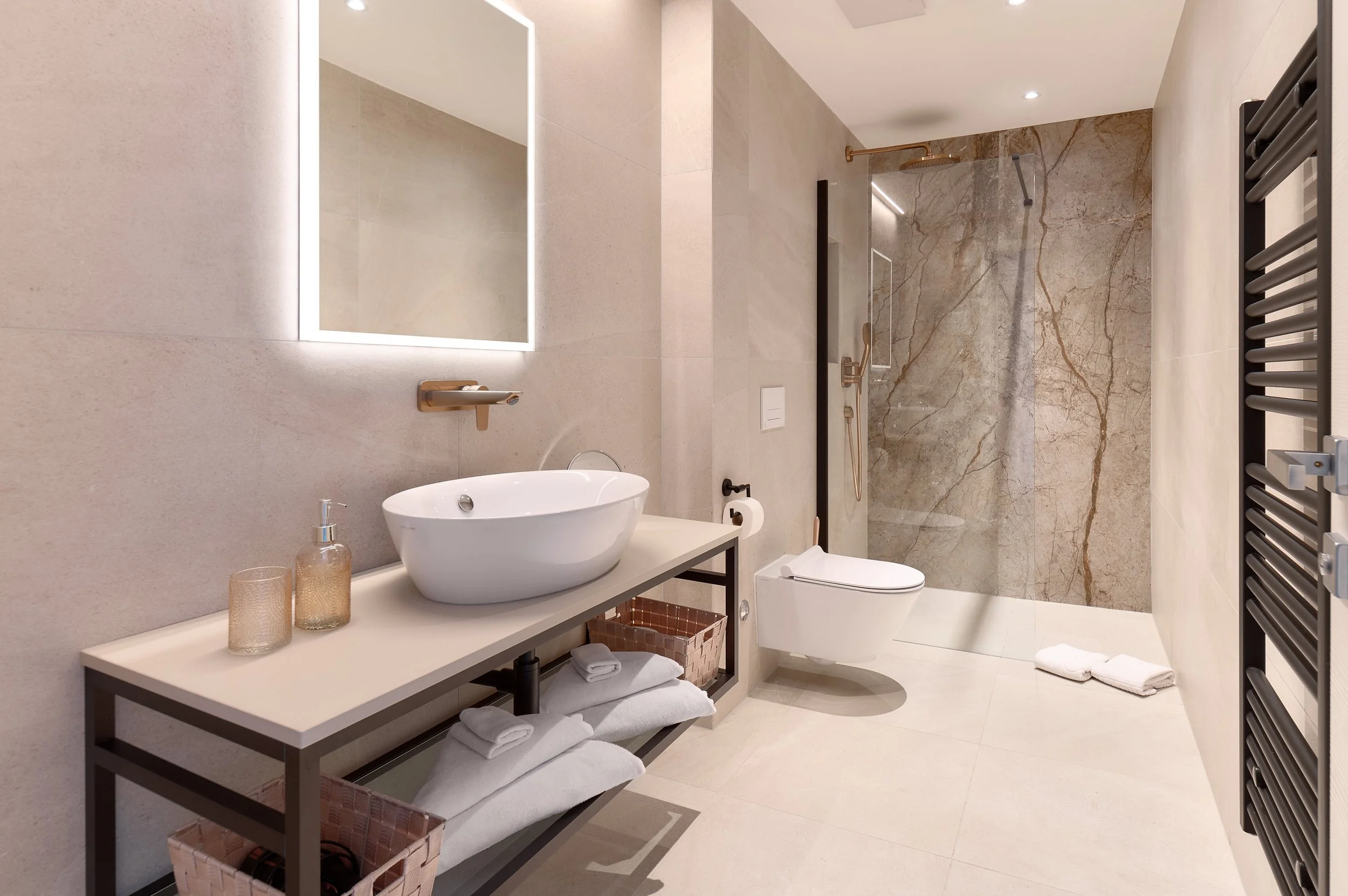 Every bedroom in the villa is a calm and restful space, each with its own uniquely designed ensuite bathroom. Individually controlled air conditioning units and blackout curtains ensure optimal comfort. The villa’s clever design accommodates multiple guests, with enough balconies, terraces, sunbeds, and outdoor sofas to ensure everyone’s relaxation. The top sun deck, perfect for sun worshippers, features a large jacuzzi and breathtaking sea and village views. The main terrace houses the pool, BBQ, and pizza oven, encouraging a balance between inside and outside living.